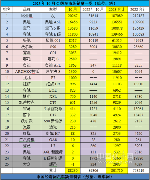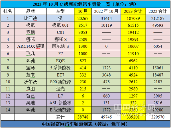 作为参照,去年10月,比亚迪汉、极氪001、蔚来ET7、宝马5系新能源、奔驰E级新能源、奥迪A6L新能源的销量分别为31614辆、10119辆、3048辆、1723辆、1772辆、131辆;去年前10个月的累计销量分别为212187辆、49593辆、18487辆、15061辆、19280辆、2816辆。
