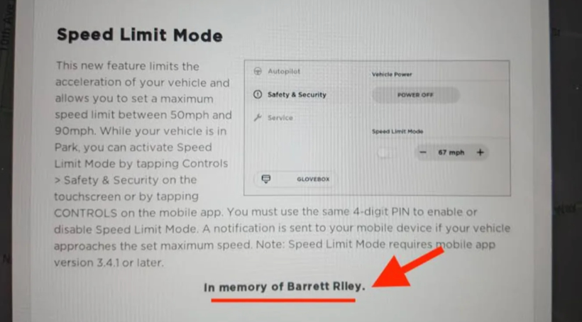 事故发生后不久,特斯拉发布了一个新的限速功能的软件更新专门为莱利。该功能允许任何特斯拉车主在其车辆上输入限速器,而不是像莱利的家人那样通过公司。