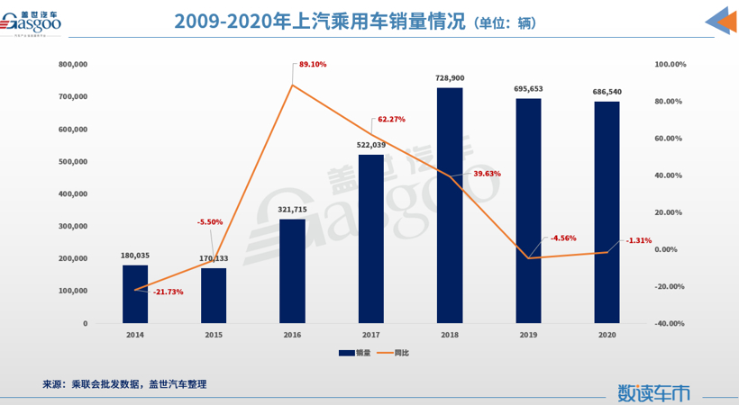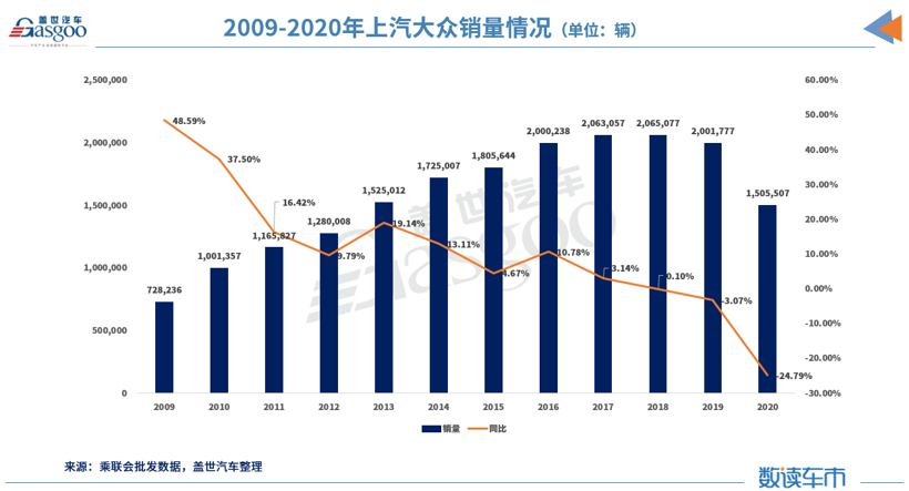 回溯上汽大众近十年的市场表现,我们发现,2010年,上汽大众年度销量首次突破100万大关,之后一路高涨并于2016年首次突破200万大关,在这之后的四年内,上汽大众的年销量一直维持在200万台规模,直到2020年,其销量下滑至150万台,同比跌幅为24.79%。