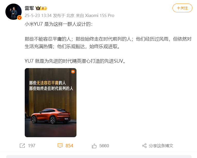 5月23日,小米集团董事长雷军在微博上表示,小米YU7是一款专为那些不能容忍平庸的人;那些始终走在时代前列的人;他们经历过风雨,但依然对生活充满热情;他们乐观豁达,始终乐观进取。