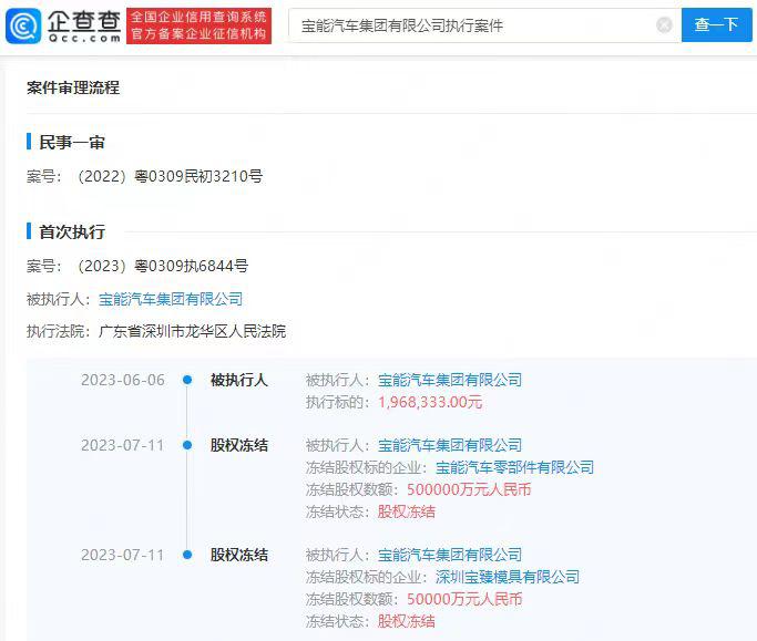 企查查APP显示,近日,宝能汽车零部件有限公司、深圳宝臻模具有限公司各新增一则股权冻结信息,被执行人为宝能汽车集团有限公司,冻结股权数额分别为50亿元人民币、5亿元人民币,冻结期限均为自2023年7月11日至2026年7月10日,执行法院为深圳市龙华区人民法院。