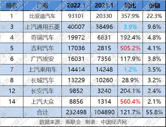 在乘联会发布的1月新能源乘用车批发销量前十五(TOP15)车企中,传统品牌占据9席,合计销量超过23万辆,同比增长121.7%;市场份额亦是接近六成,达到55.8%。由此不难看出,尽管新势力们风头正劲,但传统品牌在新能源赛道上仍然占据着优势。