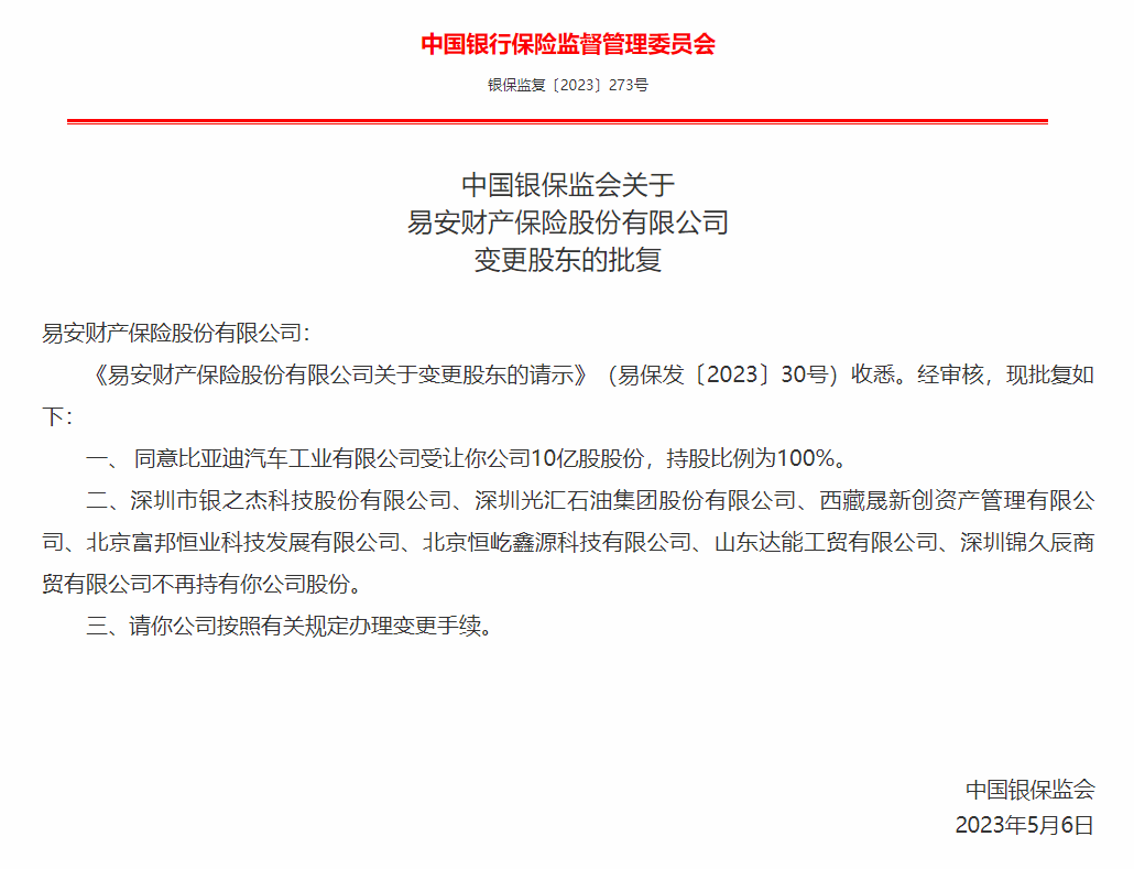 批复内容还显示,比亚迪在变更为易安财险股东后,易安财险原股东深圳市银之杰科技股份有限公司、深圳光汇石油集团股份有限公司、西藏晟新创资产管理有限公司、北京富邦恒业科技发展有限公司、北京恒屹鑫源科技有限公司、山东达能工贸有限公司、深圳锦久辰商贸有限公司将不再持有易安财险股份。
