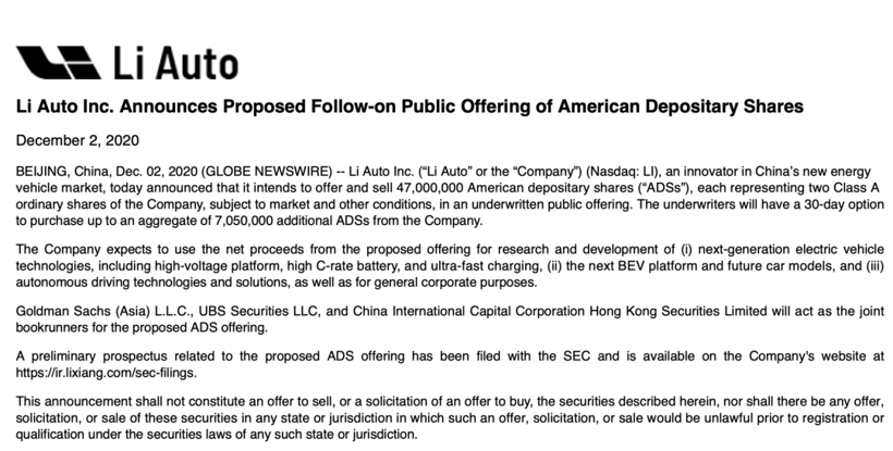 12月2日,理想汽车发布公告称拟增发4700万份美国存托股份(ADS),若以当前股价计算,理想汽车或募资约16亿美元。如果承销商行使超额配售选择权,这个数字将超过18亿美元。加上首次公开募股和同时进行的私募筹集的14.7亿美元,在几个月的时间内,理想汽车募资额已经超过30亿美元。