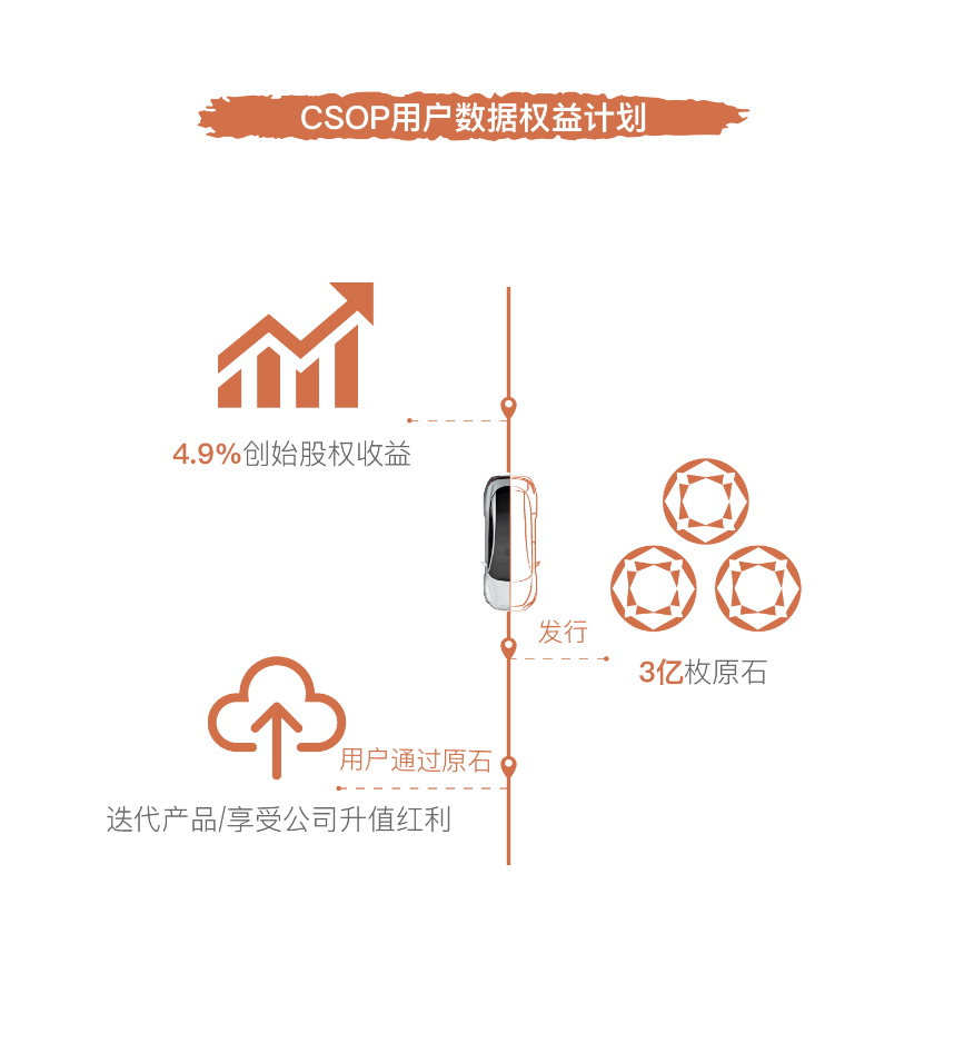 在CSOP用户数据权益计划之前,全球汽车行业还没有“将区块链技术引入用户数据价值确权”的先例。这一计划拟定的原石开采方式和相应的数据种类,实际上是在行业内率先明确了——用户数据驱动公司价值成长的边界:在所有用户数据品类中,用户的“日常行驶数据”和“品牌共创数据”最具价值进化的成长性。