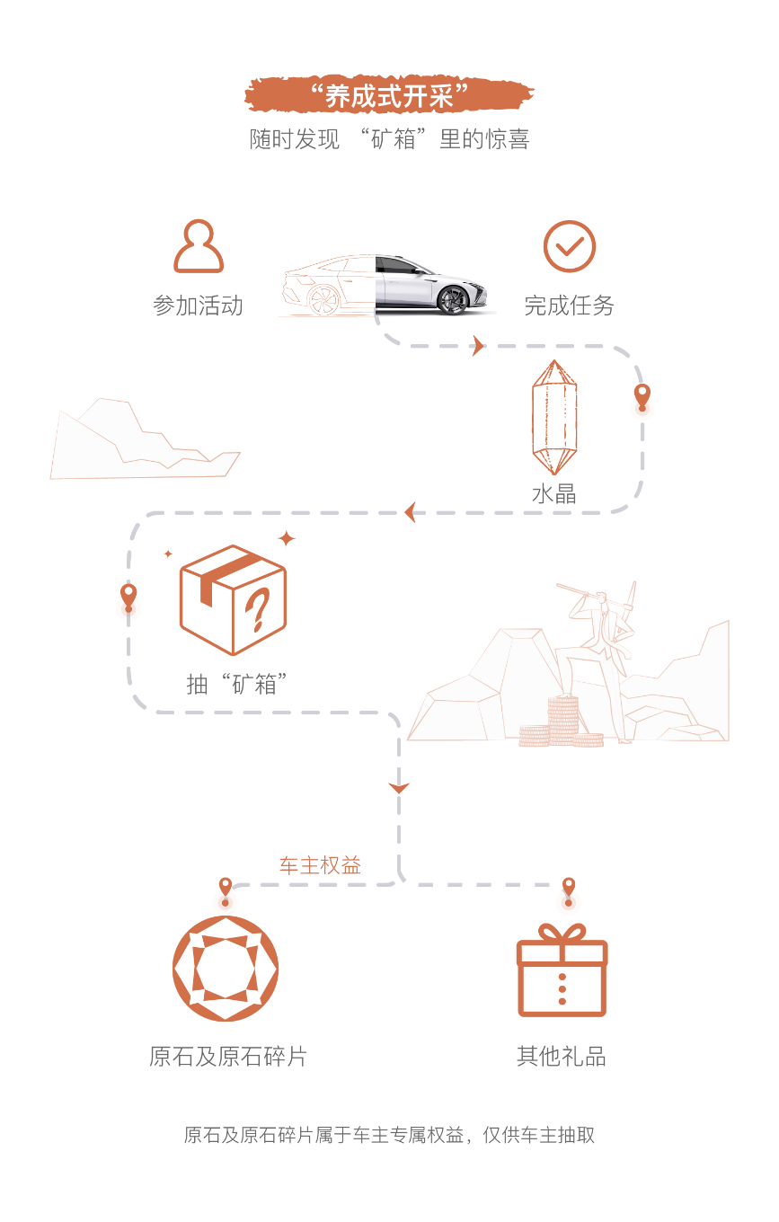 相比之下,“养成式开采”的“原石”获取路径较长,但为用户提供了更为丰富、有趣、广泛的社交体验,这部分原石约占投放总量的30%。今后,用户参与APP互动任务、品牌共创任务等,都会赢取“水晶”,积累一定的“水晶”可抽取“智己矿箱”。“矿箱”如盲盒一般,随机掉落“宝物”,其中包含品类丰富的用户权益。车主与非车主均有机会抽取矿箱,但映射股权收益的原石仅车主有资格抽取获得。